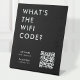 This stylish black pedestal tabletop sign provides a clean and modern way for customers or guests to access your wifi network instantly with bold typography quote "What's the WiFi Code?". The design features a central QR code area that can be linked to your wifi details so users can scan to connect without typing a password. Enter your network name and any custom instructions that fit your need. The minimalist layout keeps everything readable which works well for cafes, salons, studios, offices, rental properties, pop ups or event venues. Because the template is fully editable, it adapts easily to branding updates or new wifi information. A practical and polished solution that helps streamline customer access and elevates your in person experience.