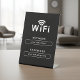 A sleek, modern black tabletop sign that displays your WiFi network and password in clean, minimalist style. Perfect for offices, reception desks, coffee shops, and contemporary homes. Just set it down—guests can log in instantly, no questions asked. Customize with your network details for a seamless, professional look.