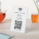This white pedestal tabletop sign provides a clean and modern way for customers or guests to access your wifi network instantly. The design features a central QR code area that can be linked to your wifi details so users can scan to connect without typing a password. Enter your network name and any custom instructions that fit your need. The minimalist layout keeps everything readable which works well for cafes, salons, studios, offices, rental properties, pop ups or event venues. Because the template is fully editable, it adapts easily to branding updates or new wifi information. A practical and polished solution that helps streamline customer access and elevates your in person experience.