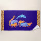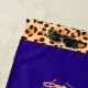 A beach towel with an exotic orange colored leopard print along the sides. Illustrated with a digital watercolor image of a herd of wild animals running together. Animals