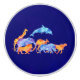 A ceramic door knob with a digital watercolor image of a herd of wild animals running together. Animals include a jumping dolphin, a giraffe, elephant, kangaroo, rhino, lion and leopard. The background is a bluish purple color.