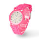I only have one complaint. I ordered the watch with clear case and strap, and what was sent was white case and strap. I'm going to keep it because 1) it looks very nice in white, and 2) it would take too long to get a replacement made and sent in time for my occasion. Aside from the mix up with the color, the watch does look very good in white. The purple dial is actually sparkly which did not show in the online images. That was a nice surprise. If you like Swatch watches this is very similar to those. It's 33.6mm in diameter, 10.5mm thick, and 40.6mm lug to lug. Stainless steel case back says 3ATM/30m WR, so no swimming or showering or submerging this one. If you like Woodstock, this is a great choice.