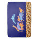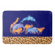 A bath mat designed with an exotic orange colored leopard print border along the bottom. Illustrated with a digital watercolor image of a herd of wild animals