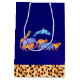 A gift bag designed with an exotic orange colored leopard print border along the bottom. Illustrated with a digital watercolor image of a herd of wild animals