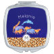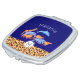 A compact mirror designed with an exotic orange colored leopard print border along the bottom. Illustrated with a digital watercolor image of a herd of wild animals