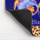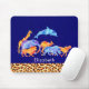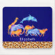 A personalized mousepad designed with an exotic orange colored leopard print border along the bottom. Illustrated with a digital watercolor image of a herd of wild animals running together. Animals include a jumping dolphin, a giraffe, elephant, kangaroo, rhino, lion and leopard. The background is a bluish purple color.