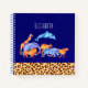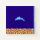 A square spiral notebook designed with an exotic orange colored leopard print border along the bottom. Illustrated with a digital watercolor image of a herd of wild animals running together. Animals include a jumping dolphin, a giraffe, elephant, kangaroo, rhino, lion and leopard. The background is a bluish purple color.