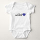 This baby romper features the phrase "Wild at heart" conveyed by the word "wild" followed by the AT sign and a blue heart.