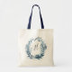 Our custom personalized tote features a blue and white watercolor botanical wreath with your single initial monogram inscribed inside in hand lettered script.