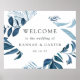 Welcome guests to your wedding with our Winter Azure poster, featuring a geometric border of icy blue watercolor greenery, foliage and botanical leaves, with "welcome to our wedding," your names, and wedding date in a chic mix of modern serif and italic typefaces.