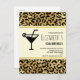 Birthday party invitation postcard with a stylish pattern featuring exotic leopard spots in black on a gold background. A black silhouette martini glass adds a party flair to the design. A cream colored rectangle frame with a faux gold foil border layered over top with your personalized text inside.