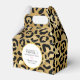 A favor box with a stylish pattern. Exotic black leopard spots on a gold background. Wild yet elegant style. A white colored circle frame with a faux gold foil border layered over top with your personalized text inside.