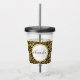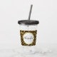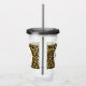 An acrylic tumbler with a stylish pattern. Exotic black leopard spots on a gold background. Wild yet elegant style. Layered over top is a white circle frame with a faux gold foil border, with your personalized monogram initial and name inside.