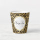 A latte mug with a stylish pattern. Exotic black leopard spots on a gold background. Wild yet elegant style. Layered over top is a white circle frame with a faux gold foil border, with your personalized monogram initial and name inside.