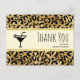 Thank you postcard with a stylish pattern featuring exotic leopard spots in black on a gold background. A black silhouette martini glass adds a nice party flair to the design. A cream colored rectangle frame with a faux gold foil border layered over top with your personalized text inside.