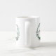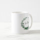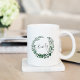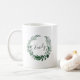 Custom mug features a hunter green and white watercolor botanical wreath with your name or initial inscribed inside in hand lettered calligraphy script.