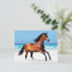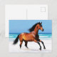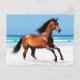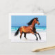 Postcard in a portrait of a beautiful wild horse galloping on a beach, with white surf and a blue sky