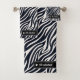 Bring a touch of luxury to your bathroom with this chic zebra print bath towel set. The design features a black and white pattern accented with a sleek black and silver label that can be personalized with your family name or monogram. Stylish and practical, add a glamorous wild side to your home décor while making everyday routines feel a little more indulgent. Perfect as a gift or for giving your own bathroom a designer upgrade. Search ID1160 to see other products with this design and additional animal print options.