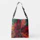This crossbody Tote Bag features original artwork by ZoeSPEAK of a croton, a tropical garden plant with variegated leaves which look like a wild animal print in the jungle. The leaves start out as green and yellow, and turn darker into reddish orange and deep blue green as they grow out in a burst of wildness.