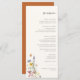 Elegant Watercolor Wildflower Floral Arrangement, wedding menu. Features, black typography on soft beige and coordinating solid terra-cotta orange color backing.