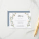 Watercolor wildflower wreath, wedding reception details card. Features, dusty blue color backing.