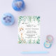 For baby's 1st birthday. A white background. a cute little baby giraffe and eucalyptus greenery and woodland ferns. Personalize and add the name and party details. Text: Wild One
