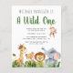 Cute budget-friendly "Wild One" 1st birthday party invitation featuring watercolor illustrations of safari animals (giraffe, tiger, lion and an elephant) and "Wild One" in a forest green script with a monkey dangling from an attached vine.