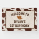 Celebrate your little one's first birthday with this cowboy western-themed banner! The customizable rustic brown text is in a bold font and the design features a cute cowboy hat. This banner is perfect for any little cowboy or cowgirl. It's also a great way to set the tone for a wild west-themed party. Saddle up and get ready for a wild ride!