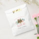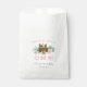 Adorable favor bags for your wild one's first birthday party feature a sweet rosy cheeked baby bear illustration flanked by pastel peach and mint flowers. "She's a wild one" appears in peach lettering. Personalize with the birthday girl's name and party date.
