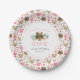Sweet paper plates for your wild one's first birthday party feature a sweet rosy cheeked baby bear illustration flanked by pastel peach and mint flowers. "She's a wild one" appears in peach lettering. Personalize with the birthday girl's name and party date on a matching background pattern of woodland animals, pink teepees, and feathers.