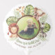 Around a child photo in round brown wood log frame, there is a group of cute jungle animals painted in watercolor: a lion, a giraffe, an elephant and a zebra, with exotic monstera and palm leaves behind them. The text "[Name] is a Wild One" is in a green handwriting script, the rest in smaller brown letters. The default name is Liam.