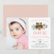 Adorable boho style party invitation's for your little one's first birthday party feature a sweet rosy cheeked bear wearing a feather, flanked by pastel flowers and leaves. "She's a wild one" appears in peach lettering. Personalize with your one year old's birthday party details in modern and whimsical peach and gray lettering, and add a favorite photo of the birthday girl on the left side. Cards reverse to solid blush pink.