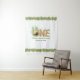 In the center, the word ONE is made from wood letters. Inside the o there is a round placeholder photo of a little boy (toddler). On the other wood letters there are palm leaves and two parrots: a blue one on the N and a green one in E. Above the O, there is the word Wild written in a green handwriting. Under that, the name and occasion are written in green , and the date under it, in gray. The default name is William.