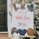 Cute safari theme baby shower welcome sign featuring illustration of zoo animals (lion, elephant, rhino, snow leopard, zebra, and giraffe) with pink flowers, crowns, and party hats. The text says "a little wild one is on the way." Perfect for a girl's baby shower.