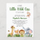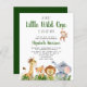 Cute budget-friendly "little wild one" baby boy shower invitation featuring watercolor illustrations of safari animals (giraffe, tiger, lion, elephant and a monkey) and "Little Wild One" and the mother-to-be's name are in a forest green script.