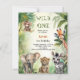 An invitation celebrating a boy's 1st birthday. A jungle, rainforest background with baby safari animals. Monkey, elephant, lion, Zebra nd giraffe. Personalize and add a name and party details.