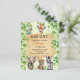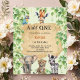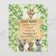 An invitation celebrating a boy's 1st birthday. A jungle, rainforest background with baby safari animals. Monkey, elephant, lion, Zebra, giraffe and a parrot. Personalize and add a name and party details.