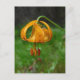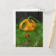 This color photograph captures a single orange woodland tiger lily wildflower bloom, at the end of its season. The petals curl up and back to the stem, exposing the pollen heavy tips. Photo taken along the forest service roads to Ross Lake, southern British Columbia.