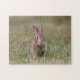 Adorable little cottontail rabbit hopping in the grass toward the camera.