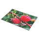 Wild red raspberries are the theme of these fine art placemats. Two juicy berries with a cerise color are attached to the red brown bramble branches. Green leaves and an aqua turquoise background complete the abstract design. The photography has been digitally enhanced to create an impressionistic feeling.