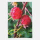 Wild red raspberries are the theme of this fine art kitchen towel. Two juicy berries with a cerise color are attached to the red brown bramble branches. Green leaves and an aqua turquoise background complete the abstract design. The photography has been digitally enhanced to create an impressionistic feeling.
