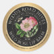Vintage wild rose illustration by French artist with metallic gold border and honeybee; ingredients, business name, address and net weight. Black and gold.
