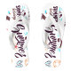 A pair of white flip-flops with a summer-themed design. The design includes the word "Summer" in a stylized, cursive font, along with various beach-related icons such as seashells, beach chairs, flip-flops, lifebuoys, and suns. The color palette is bright and cheerful, with shades of blue, orange, and brown against the white background of the flip-flops. The overall style is playful and summery, perfect for a day at the beach or a casual outing.