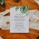 This wild tropical destination wedding welcome letter is perfect for a destination wedding welcome bag. The design features an exotic array of green watercolor banana palm tree leaves, ferns, foliage, botanical plants and greenery for a tropical summer feel. The front of the card features a welcome letter and optional itinerary.