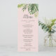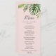 This wild tropical palm blush wedding dinner menu card is perfect for a beach or destination wedding. The design features an exotic array of green watercolor banana palm tree leaves, ferns, foliage, botanical plants and greenery on a blush pink background for a tropical summer feel. This menu can be used for a wedding reception, rehearsal dinner, or any event.