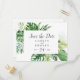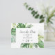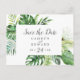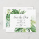 This wild tropical palm save the date postcard is perfect for a beach or destination wedding. The design features an exotic array of green watercolor banana palm tree leaves, ferns, foliage, botanical plants and greenery for a tropical summer feel.