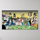 Cartoon Illustration of an intense poker gamme including all the characters you would find in any western inclding the gunslinger, rancher, blacksmith, irish immigrant, the local indian, dancehall girl, barmaid, sheriff, his deputy intertaker, the kid that rides off into the sunset, and the mexican laborer. full color on canvas