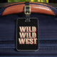 Retro style grunge "Wild Wild West" text design with striped letters in yellow, red and beige colors