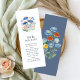 Beautiful "Books for Baby" favor bookmark with vibrant watercolor wildflowers — dusty blue cornflowers, daisies, pink petals, coral pops, blue accents, and green leaves. Sweet navy poem asks guests to bring a book instead of a card, sign inside, and write a note: "Will Be A Treasure The Baby Won't Hide!" Dusty blue reverse side. Ideal for Baby in Bloom, boho garden, gender-neutral, or dusty blue showers. High-quality cardstock, pre-punched optional, matches your full suite: cups, signs, thank you tags, favor bags.