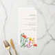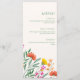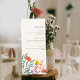 The layout features a clean, refined structure with subtle botanical accents and colorful wildflowers that add warmth without overwhelming the design. The result is a timeless and sophisticated menu display that fits effortlessly into garden weddings, outdoor celebrations, and romantic reception settings.